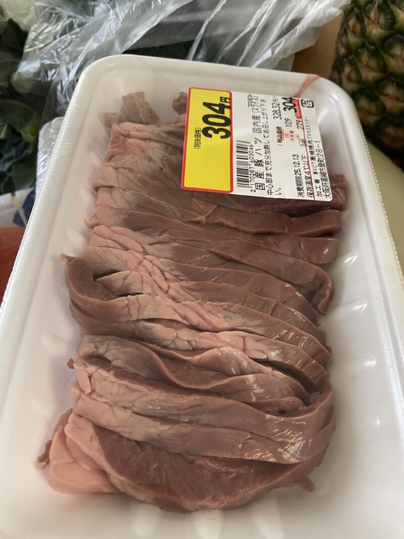 ロピアでね、豚の端はよく買うんですが最近見つけた豚ハツ。コリコリしてむっちゃ美味しかったんです。ぜひ食べてみて。苦手な人もいると思いますが塩コショウで炒めてみて。合わせて豚タンも激安なのでおすすめ。